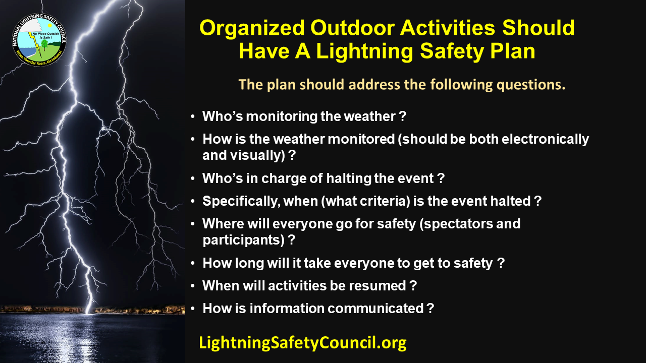 For organized outdoor activities, the National Lightning Safety Council and the National Weather Service recommend that organizers have a lightning safety plan and follow it without exception. The plan should give clear and specific safety guidelines to eliminate errors in judgment. These guidelines should address the following questions.